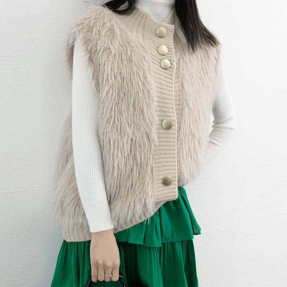 シーズンムード高まるふわふわな肌触り、ずっと触っていたくなるフェイクファー素材とちくちくしない上質ニット素材で仕上げた異素材mixジレ