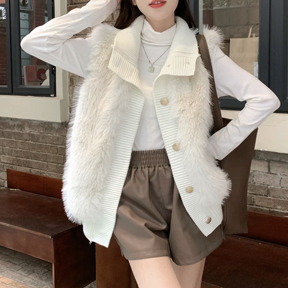 韓国 ファージレ きれいめ スタンドカラーファージャケット 袖なしファーカーディガン 秋冬 ニットアウター 羽織り着やせ